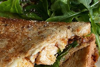 Faites cuire les filets de poulets à l'huile d'olive.Pendant ce temps préparer la sauce moutarde miel en mélangeant les deux ingrédients dans un bol.Etaler la sauce sur une tranche de pain, disposer le poulet la mozzarelle, la roquette et les tomates séchées. Faire cuire 5 minutes de chaque côté.C'est prêt!!
