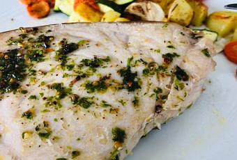 Espadon au pistou de persil et légumes au four