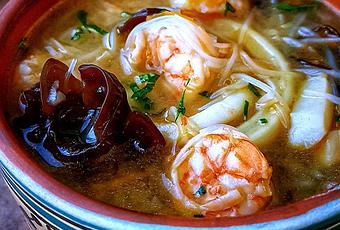 - يضاف الجمبري وشعرية الأرز، ثم الفطر الأسود، صلصة نيوكمان، صلصة الصوجا، الزنجبيل، القليل من الملح، البقدونس والجزر.