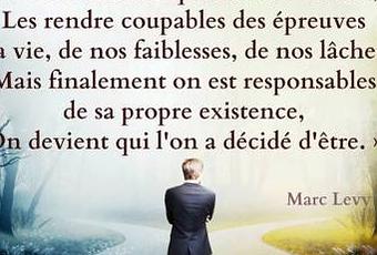 On peut blâmer son enfance, accuser indéfiniment ses parents de tous les maux qui nous accablent, les rendre coupables des épreuves de la vie, de nos faiblesses, de nos lâchetés mais, finalement, on est responsable de sa propre existence. On devient qui on a décidé d'être. - Marc Lévy