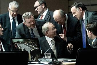 Cinquante ans après Z, on comprend donc d’autant mieux l’attrait de Costa-Gavras pour le livre Adults in the Room, que Varoufákis a tiré de ses quelques mois de réunions, d’échanges, et de débats au sein des arcanes de l’UE. S’il avait un peu perdu de sa superbe ces dernières années, cette adaptation permet au réalisateur franco-grec de retrouver toute sa verve sociale et politique, ainsi qu’une acuité certaine dans sa manière de dépeindre l’absurdité du fonctionnement d’institutions totalement déconnectées des besoins des citoyens. Si la mise en scène déployée par Costa-Gavras pourra laisser les plus esthètes sur leur faim (en dehors d’une très belle séquence finale en guise de pinacle d’une tragédie grotesque, aux frontières du rite de passage sectaire), en faisant montre d’un classicisme assez décevant lorsque l’on a en tête ce que Costa-Gavras a pu proposer sur Z et Amen notamment, la valeur d’Adults in the Room tient avant tout dans la précision de ses dialogues, et la justesse de ses choix narratifs. En jouant constamment sur les contradictions (parfois enchaînées en quelques secondes) des personnages secondaires, par un habile jeu de montage ou un échange en champ-contre-champ simple mais pleinement signifiant, Costa-Gavras dépeint un monde où la parole donnée n’a plus aucune valeur, où la logique et le bon sens ne font plus loi, et où le lien démocratique entre les électeurs et les institutions n’est rien de plus qu’une illusion se fracassant sur les murs figés de la loi du marché.