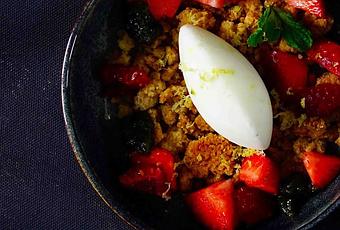 Il se compose d'une base de crumble ,de la glace aux citrons , de fraises , d'un pesto de menthe . J'avais testé ce pesto de menthe dans un recette précédente de Cédric Grolet . Un pesto sucré c'est très sympa avec le citron, essayez vous allez adorer .