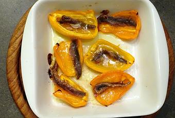 L'autre soir j'avais un petit creux et je me suis rappelée qu'il me restait quelques mini poivrons et j'avais vu passer une recette sur le blog pour un petit en-cas. Il suffit de couper les mini poivrons en deux, enlever les pépins et poser un anchois dedans. J'ai utilisé des anchois au piment de la semaine espagnole de Lidl. Verser un filet d'huile d'olive sur les poivrons et enfourner pendant 20 au fours 200°C.