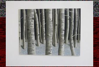 Les salles de l’américain Sean Landers (né en 1962) sont plutôt séduisantes. Un monde étrange, drôle, souvent proche du Surréalisme. On circule aisément dans cet univers d’artiste, cohérent dans son expression. En fait, il s’agit en permanence de lui! L’artiste! L’expo est un portrait géant de Sean Landers! –L’écriture, d’abord. Très présente dans son travail. Elle le raconte, sous forme de journal, de notes, de sentences, de citations…Tout cela peint avec réalisme (bibliothèques, panneaux indicateurs, toiles couvertes de lettres, fonds de tableaux, forêts de bouleaux à l’écorce gravée de noms et de mots…).