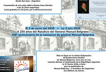 Le 3 juin, pour l’une des dates-clés de cette Année du Général Manuel Belgrano, je serai donc à la fois en Argentine, grâce à une radio catholique de la province de San Juan, Radio Madre de Dios (1), et à Ricardo Sánchez Alonso, l’animateur de son émission Entrevista sobre Educación, tout en étant présente physiquement en France, d’où je mettrai en ligne un nouveau montage vidéo, cette fois-ci à partir de l’enregistrement de ma conférence du 27 février dernier à l’Ambassade argentine à Paris.
