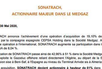 La compagnie nationale des hydrocarbures Sonatrach est devenue actionnaire majoritaire de la société Medgaz SA, après avoir achevé samedi une opération d'acquisition de 19,10% des actions détenues par la compagnie espagnole Cepsa Holding dans cette société.