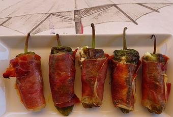 Enrouler chaque piment d'une tranche de jambon Serrano