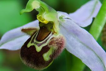 Ophrys apifera (Ophrys abeille) : tige robuste, verte ; feuilles inférieures étalées en rosette, les supérieures dressées ; bractées foliacées ; inflorescence lâche ; grandes fleurs : sépales roses avec une nervure médiane verte, pétales très petits, velus, vert-jaunâtre, labelle trilobé à sa base, brun à brun-rouge, gibbosités velues très développées, lobe médian bombé à bords rabattus vers l'arrière, macule entourée d'un liseré jaunâtre, appendice vert-jaunâtre dirigé vers l'arrière, gynostème long, pollinies à l'extrémité de longs caudicules et tombant sur la surface stigmatique à maturité.