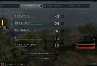À votre arrivée en Aeternum, chacune des caractéristiques de base de votre personnage affichera 5 points, un seuil en dessous duquel vous ne pouvez pas descendre. À chaque montée de niveau de votre personnage, vous recevez un point à affecter à la caractéristique de votre choix. Si vous faites progresser vos caractéristiques de cette manière uniquement, elles ne peuvent pas dépasser 60 points. Pour franchir ce plafond, vous pouvez vous aider de talismans, mais les gains vont en diminuant au-delà de ce stade. Si vous pensez avoir placé un point sur une caractéristique par erreur ou souhaitez remanier votre répartition de points générale, vous pouvez le faire moyennant quelques pièces. Au début du jeu, ce type de remaniement est gratuit pour permettre aux joueurs d’expérimenter librement.