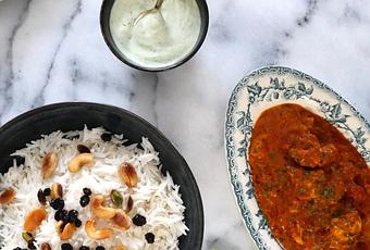 Un poulet Tikka massala crémeux et relevé à la fois grâce à une sauce tomate dense, de la coriandre fraîche, servi avec un riz basmati parfaitement cuit garni de fruits secs, un chutney à la menthe et des naans.
