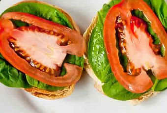 Coupez votre pain en deux, déposez sur chaque partie une feuille d'épinard ou laitue puis en dessus une rondelles de tomate.