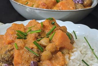 Comme le beau temps et le soleil semblent nous bouder ces jours-ci, je vous propose un plat bien réconfortant : des boulettes de viande cuites dans une sauce tomates aux saveurs indiennes, enrichies de poischiche et de patates douces.Nigella Lawson propose, pour une version express, de prendre des boulettes bio prêtes à l’emploi ainsi que des légumes coupés en barquettes.J’ai fait mes propres boulettes et omis la courge musquée côté légumes (je n’en avais pas trouvé).J’achète toujours ma viande à 20% de matière grasse pour avoir des boulettes plus goûteuses et plus moelleuses. Je n’ai pas mis la totalité du bouillon dans la marmite car je n’avais plus de place. Cela a donné une sauce épaisse et pleine de saveurs.C’est un plat qu’on peut réaliser pour un repas familial ou pour recevoir et profiter de ses amis puisque le plat peut se préparer à l’avance.D'autres recettes de NIgella Lawson : ici.Passez un bon dimanche et prendre soin de vous.