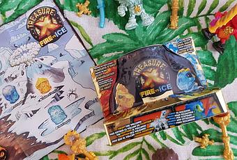 Un volcan qu'il faut faire exploser de sa lave (orange pour le feu ou blanche pour la glace) pour trouver la clé du trésor. Puis à l'intérieur il y a une figurine à extraire avec son sceptre, sa boule de trésor. Cette figurine est prise dans une sorte de slime gélatineux bleu ou orange. Timothée adore la texture!! Une fois libéré, le personnage a son arme, son sceptre et son trésor associé !! Tout est là pour jouer et faire une collection géniale de ces figurines ! Succès phénoménal ici, carton plein mais attention aux tympans face aux hurlements de joie et d'excitation !