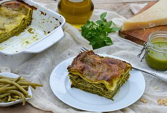 Déposer une couche de lasagnes dans le plat. Recouvrir d'une couche de pesto, déposer quelques haricots verts puis parsemer de parmesan râpé.