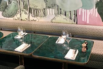 La terrasse de quarante places reste ouverte été comme hiver. Ponctuée de chaises treillis en laiton doré et habillées de tissu floral, elle est conçue comme le prolongement du parc dont l'esprit se poursuit dans la brasserie, imaginée comme un jardin intérieur.