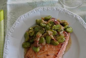 Servir le saumon dans l'assiette et napper des fèves en sauce et servir.