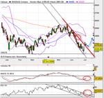 Le Nasdaq est bel et bien revenu dans une tendance court terme haussière. On constate en effet que les indicateurs ont franchis à la hausse leur canal baissier, il en est de même pour l'indice phare de wall street. La MACD repasse au-dessus de sa moyenne également. La moyenne mobile à 20 jours en rose sur le graph fait de la résistance mais elle devrait céder car un gap baissier laissé ouvert à 2360 pts fin juin attire les cours vers une poursuite de la hausse. Les cours devraient sans doute consolider encore autour des 2250-2280 pts avant d'aller chercher les 2360 pts. Là on se retrouvera en contact avec la bollinger haute ainsi qu'aver la moyenne mobile à 50 jours en bleu sur le graph pour un vrai test de la force des bulls et une réponse à la question rebond technique, ou reprise en main des bulls ?