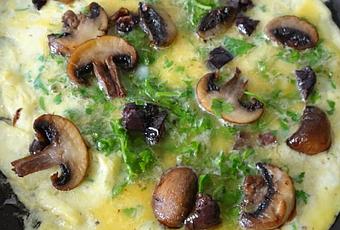 Éparpiller quelques morceaux d'olives et des tranches de champignons sur les œufs pas encore coagulés