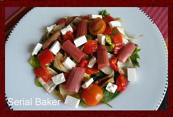 Ingrédients (pour 4 parts)- 3 tiges fines de rhubarbe- 2 petits poivrons rouges- 100g de feta- 2 petites tomates ou 4 tomates cerise de grosse taille- 50g de roquette- 50g de pousses d'épinards- quelques feuilles d'une autre salade (j'ai utilisé de la sucrine)- 1 petit bulbe de fenouil