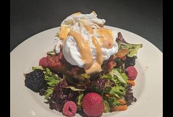 Salade espagnole. Oeuf poché sur salade mixte et tien de légumes.