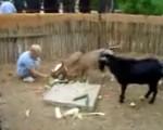 Le bouc veut charger une biquette mais il se trompe de cible, et c’est un enfant qui ramasse quelque chose qui se fait charger le popotin.
