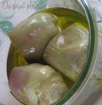 5. Tassez légèrement les artichauts refroidis dans un bocal, ajoutez l'ail pressé (si votre ail n'est pas de première jeunesse, ébouillantez la gousse au préalable), ajoutez également la branche de thym effeuillée, le vinaigre balsamique blanc, 2 tours de moulin à poivre. Couvrez d'huile à hauteur. Fermer le bocal, stockez au frais une huitaine de jours maximum. Meilleurs le (sur)lendemain que le jour-même.