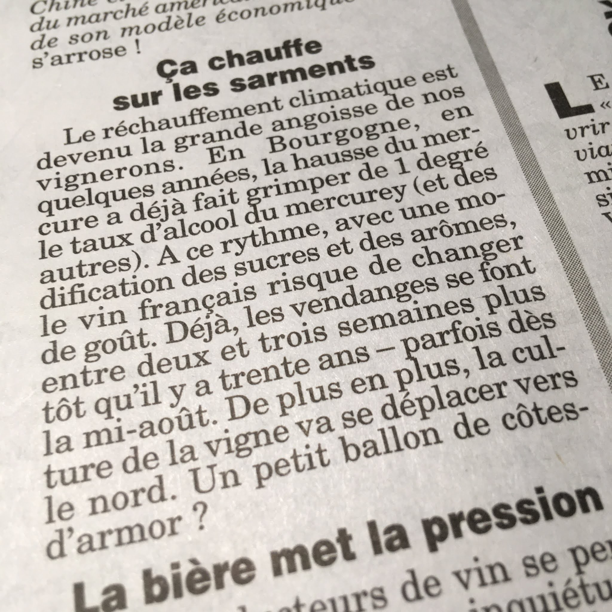Pour le reste (l'augmentation des degrés) : peut-être faudrait-il également s'intéresser à la recherche de maturité, donc d'alcool, qui s'est imposée depuis le début des années 80. Mais aussi, mais surtout, aller voir du côté de la modification des façons culturales et tout ce genre de choses techniques et donc parfaitement chiantes quand on veut sauver le monde sans trop se prendre la tête.