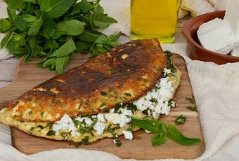Lorsqu'elle est cuite, répartir le brocciu et la menthe sur une moitié de l'omelette.