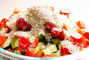 Ensuite lavez et coupez les courgettes en petits dés et tomates cerises en deux.