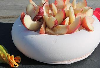 Ajoutez-y ensuite la moitié de la meringue italienne à votre purée de pêche puis mélangez doucement à l'aide d'une maryse