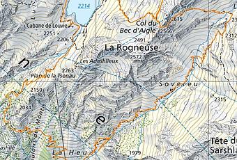 Arrivée à l'alpage puis montée à droite du ruisseau (rive gauche) dans les blocs. Arrivée à un petit chalet (Le Da). Vu sur les Combins.