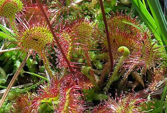 Drosera rotundifolia (Rossolis à feuilles rondes) : plante vivace carnivore ; rosette de feuilles pétiolées à limbe orbiculaire, garnies de poils glandulaires rougeâtres ; petites fleurs blanches.