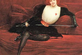 Sur sofa rouge ou sofa vert, la trouvaille de Béraud est le petit coeur rouge vif sur la poitrine blousante, encore mis en valeur par la rousseur de la chevelure. Si la fille de gauche, avec son gant d’escrime, peut lointainement prétendre illustrer une sportive, celle de droite, avec ses longs gants noirs flattant la lame par les deux bouts, fait partie du club des femmes fatales.