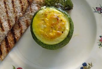 Remplir les courgettes avec un mélange de cubes de fromage, de jambon et un peu de la chair de courgettes émincée