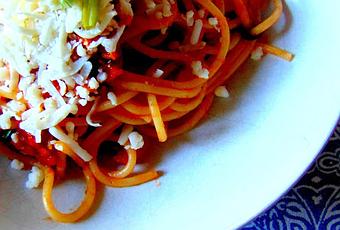 Je cuisine peu avec les PVT* parce qu'elles n'ajoutent pas beaucoup de goût... contrairement au tofu qui absorbe les saveurs... au tempeh qui en donne... de même que les graines de tournesol...sans compter les merveilleuses lentilles rouges. Tout ça donne des résultats admirables dans une bolognaise. Entre autres plats.Mais ce soir-là, "fouille-moi pourquoi", j'avais envie d'une bolognaise de pvt. Chose faite. Avec bonheur; je dois en convenir.