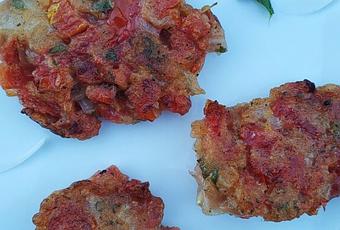 * dans une poële, mettre un fond d’huile, quand elle est bien chaude, verser une cuillère à soupe de mélange à la tomate