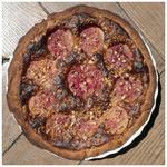 Étaler la pâte dans un moule préalablement beurré, si c’est trop difficile à faire avec un rouleau à pâtisserie (pâte trop molle ou qui colle, c’est le risque), le faire directement dans le moule avec les doigts ! Puis étaler l’appareil régulièrement. Enfoncer dedans les demi-pêches ou alors coupées en quartier. Saupoudrer avec les pistaches.