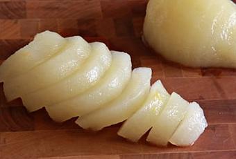 Chauffez votre four à 180°, beurrez un moule à tarte rond, pelez et coupez les poires en rondelles fines.