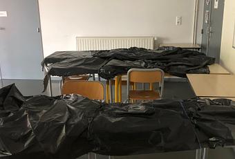 Et que font ces sacs en plastique ? Simple, sous les sacs poubelle, il y a les dossiers des élèves et les carnets de correspondance pour 550 élèves. C’est pour la poussière ? Ah non, c’est pour éviter que l’eau qui coule du toit depuis plus de six mois ne viennent tout gâcher. Ce qui brille dedans la porte au fond n’est pas du cirage mais la flaque qui se formait vendredi en fin d’après-midi.