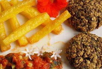 Aujourd'hui, je vous propose des Galettes de lentilles, accompagnées de frites de Polenta et d'une sauce improvisée (Vegan) :
