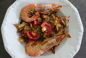 Garnir avec quelques petites tomates cerises coupées en 2, encore un filet d'huile d'olive, les gambas, les chips d'artichauts et une feuille de basilic (vidéo de la recette ).