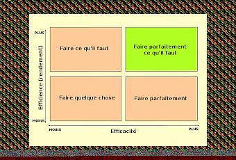 Une autre façon de définir le tout en simplifiant un peu, est de dire que la différence entre efficacité et efficience se défini ainsi : être efficace, c'est faire ce qu’il faut faire en étant efficient, c'est à dire faire les choses qui sont les plus nécessaires de façon parfaite.