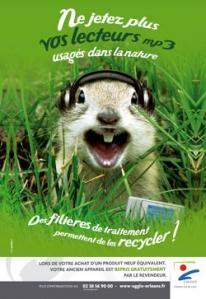 Je suis souvent “agacé” par des campagnes surfant sur la mode du développement durable, souvent moralisatrices, ou donnant bonne conscience à l’annonceur. L’Agglo d’Orléans change de ton en faisant intervenir un écureuil ou un canard dans leurs visuels : l’animal utilise un de nos vieux appareils électriques (MP3, téléviseur, jouet, …) jeté -par mégarde- en pleine nature. Le clin d’oeil est sympa et met en scène directement l’animal avec le déchet non recyclé. On est bien loin des messages “donneurs de leçons” nous expliquant la couleur des poubelles ou nous culpabilisant. Cette campagne, diffusée en affichage et sur le net (voir le site de la Tribune d’Orleans), nous parle en consommateurs responsables, sans infantiliser la cible ! un seul hic : le site internet figurant en lien derrière les bannières est d’une tristesse incroyable. On aurait aimé une cohésion entre les différents supports, avec des pages web revisitées pour l’occasion. Une mise en page et des messages rappelant la campagne en cours, nous auraient donné envie de parcourir davantage les informations complémentaires, comme l’Agglo a si bien sû le faire avec vélo+ (qui fera l’objet d’un prochain post) !