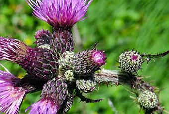 Cirsium palustre (Cirse des marais) : tige dressée ailée et épineuse ; feuilles très épineuses, longuement décurrentes ; inflorescence de petits capitules sessiles agglomérés, fleurs toutes tubulées purpurines, involucre à bractées lancéolées à pointe courte et noire ; akènes surmontés d'une aigrette à soies plumeuses.