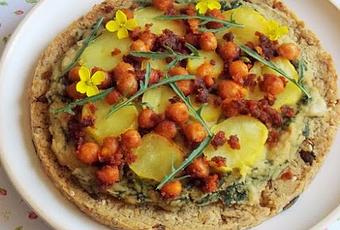 Aujourd'hui, je vous propose une Tarte fine (sarrasin-pois chiches) aux orties et aux pommes de terre (Vegan) (pour 2 personnes) :