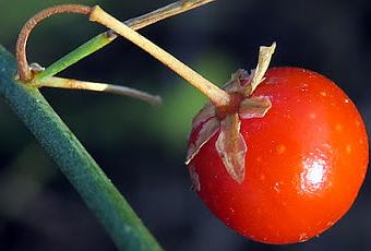 Asparagus officinalis (Asperge) : plante vivace à rhizome ; tiges nombreuses et très ramifiées portant des pseudofeuilles linéaires très fines (cladodes) ; petites fleurs blanc-verdâtre isolées à l'aisselle des cladodes et longuement pédicellées ; baies vertes puis rouge vif en automne.