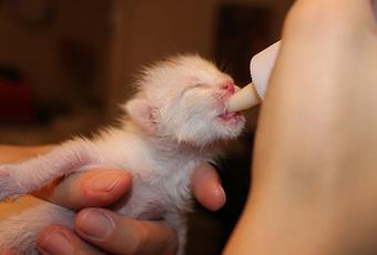 Un chaton ne peut encore consommer de nourritures solides. Il se contente du lait que lui donne sa mère. Ce lait contient tous les apports nécessaires à sa croissance. Après plusieurs jours, lorsque la mère commence à manquer de lait, elle va commencer à introduire de la nourriture solide dans l'alimentation de sa progéniture.