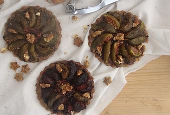 L'un des avantages de résider dans le Sud-Ouest et dans une petite ville où la campagne n'est pas bien loin, c'est que j'ai parfois l'impression, surtout à cette saison, d'habiter dans un garde-manger géant. Il suffit d'une petite balade pour revenir à la maison les paniers pleins de fruits, baies ou autre trésors glanés le long des chemins. La saison des figues touche à sa fin ici, celle des noix démarre juste, ces tartelettes sont donc une illustration parfaite de cette période de transition entre les beaux jours et les premiers frimas (même si la transition a été quelque peu brutale cette année !).Avec les températures plutôt fraîches et le temps maussade de ces derniers jours (même si ça à l'air d'aller un peu mieux maintenant), j'ai eu envie de réconfort, d'un petit dessert de saison, et l'association figues-noix m'est venue assez naturellement. Et puis au moment de préparer la pâte, pour rester dans le thème de l'automne, j'ai ajouté un peu de farine de châtaigne à la pâte. Cette dernière apporte un petit goût sucré qui se marie très bien avec la rusticité des noix. Comme les figues sont déjà des fruits très sucrés, surtout que les miennes étaient très mûres, je n'ai pas jugé utile de rajouter beaucoup de sucre, mais c'est bien sûr à adapter en fonction de votre palais et du degré de sucrosité de vos figues.