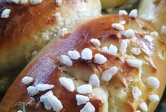 * badigeonner avec un mélange jaune d’oeuf et 5 cs de l’eau, terminer par le sucre en grains