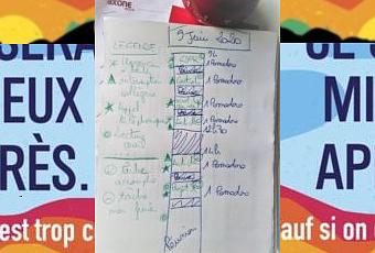 A la fin de la journée, vous êtes en mesure de faire un bilan. Pour cela, mettez en place une frise journalière, avec le découpage de votre journée, et des événements qui s’y sont passés. Voici un exemple